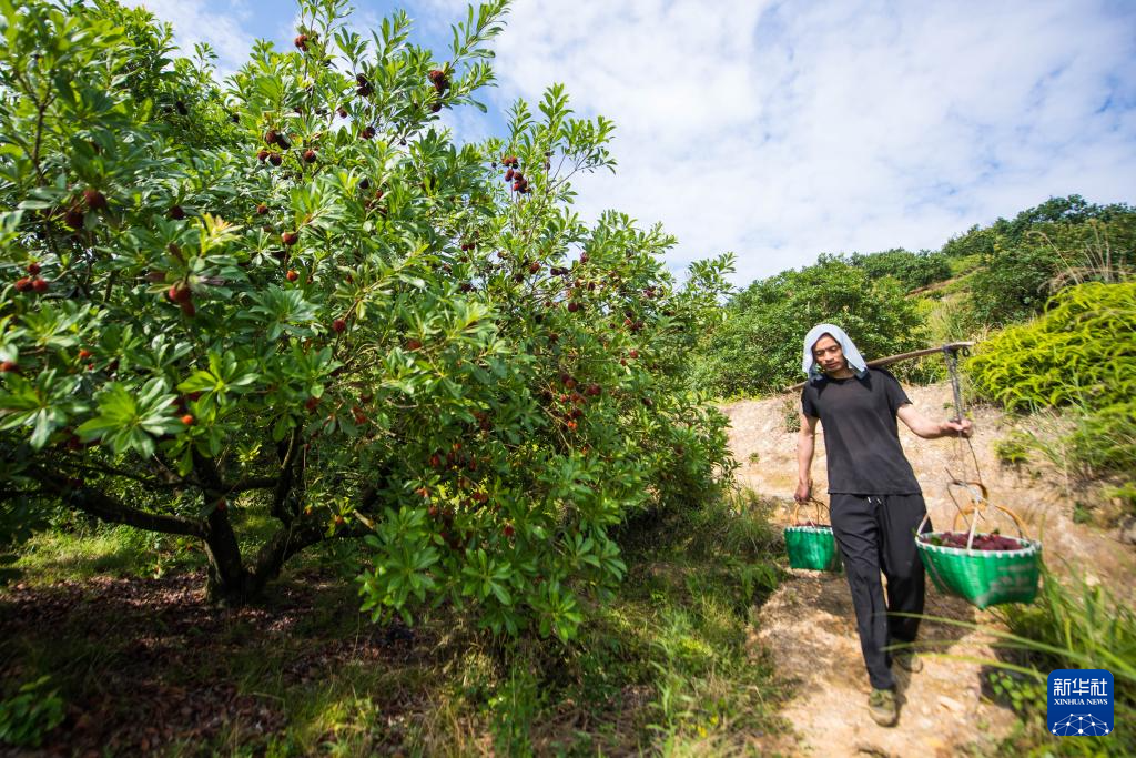 6月23日,农户在浙江省文成县环飞云湖杨梅基地采摘东魁杨梅。