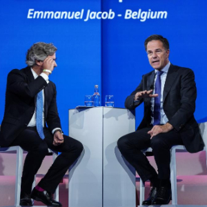 6月24日,在荷兰海牙,北约秘书长吕特(右)在北约公共论坛上讲话。