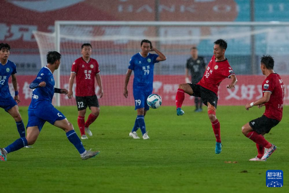 6月21日,常州队球员卢志勇(左一)在“苏超”第五轮对阵南京队的比赛中。最终,常州队主场0比4不敌南京队。