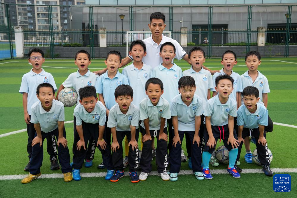 6月22日,卢志勇和校队小球员们在学校足球场上合影。