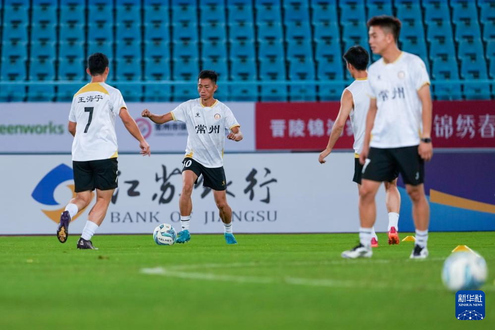 6月21日,常州队球员卢志勇(后排中)在“苏超”第五轮比赛前的出场仪式上。最终,常州队主场0比4不敌南京队。