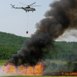 6月24日,一架直升机运载全地形运兵车和灭火队员到达黑龙江省大兴安岭地区的演习现场。