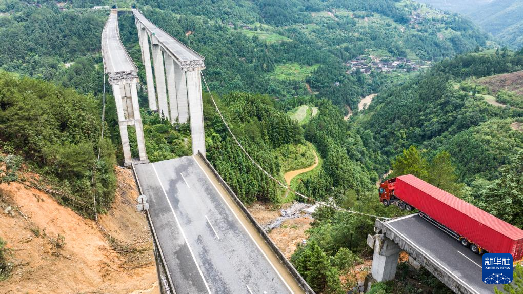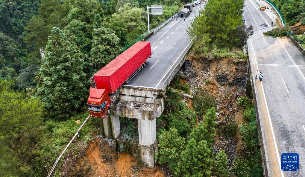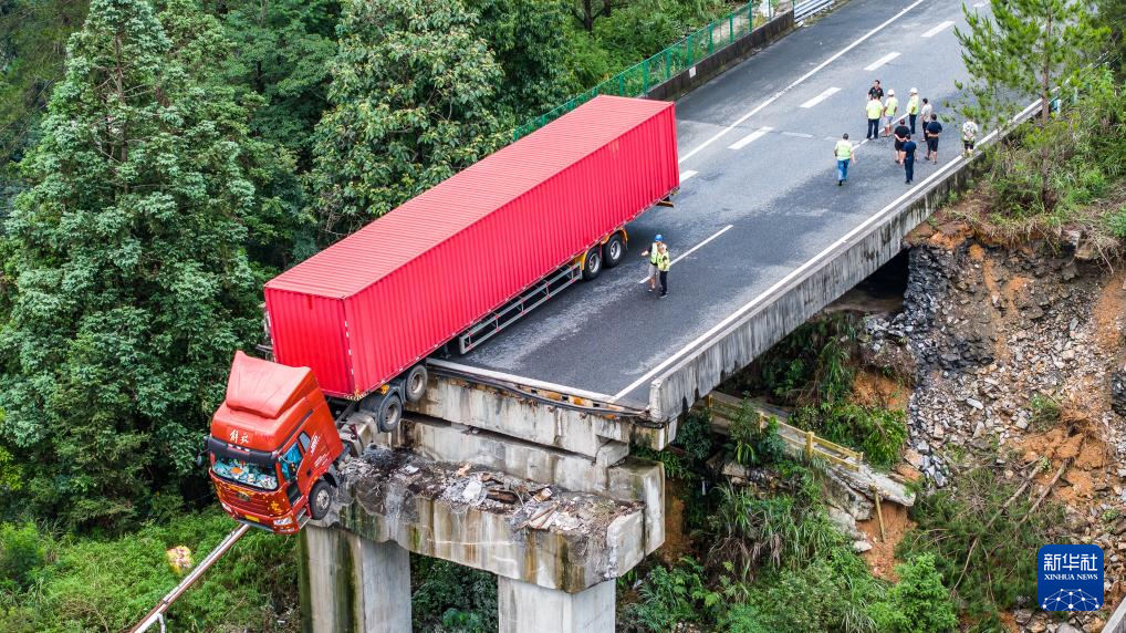 6月24日,一辆货车卡在断桥边缘,车上人员已被救出。