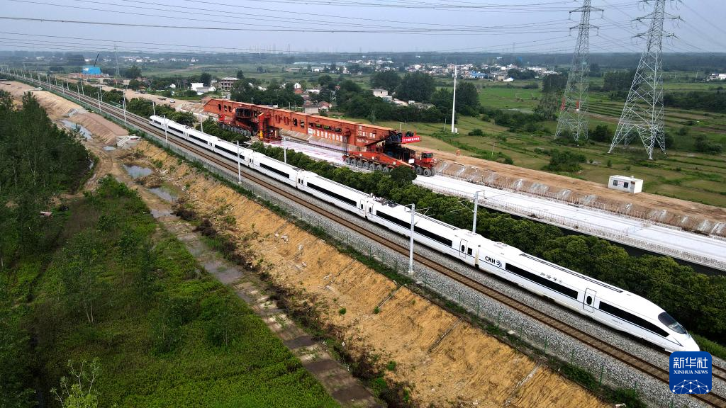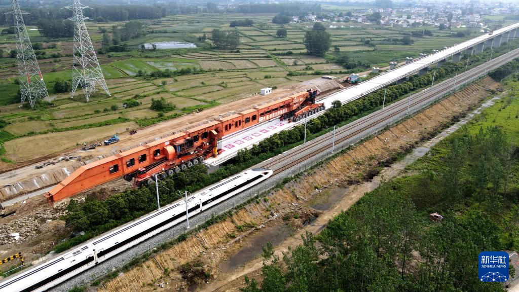 新建沪宁合高铁安徽段站前四标最后一榀40米箱梁完成架设(6月25日摄,无人机照片)。