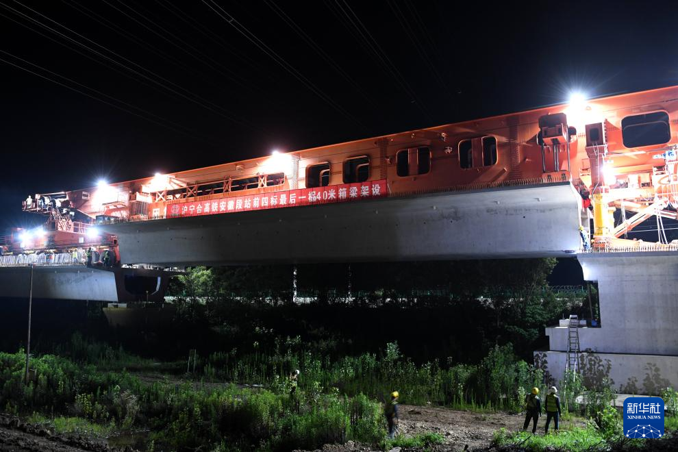 新建沪宁合高铁安徽段站前四标最后一榀40米箱梁架设现场(6月25日摄)。