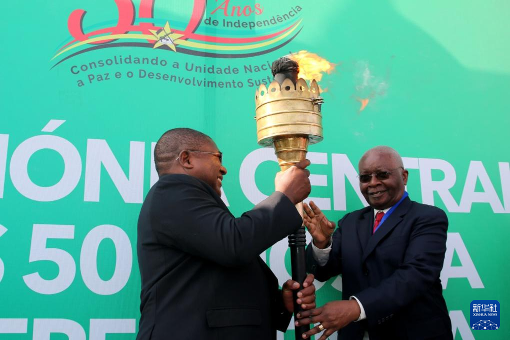 6月25日,在马普托省马托拉市举行的莫桑比克独立50周年庆典上,莫桑比克两任前总统阿曼多·格布扎和菲利佩·纽西传递火炬。