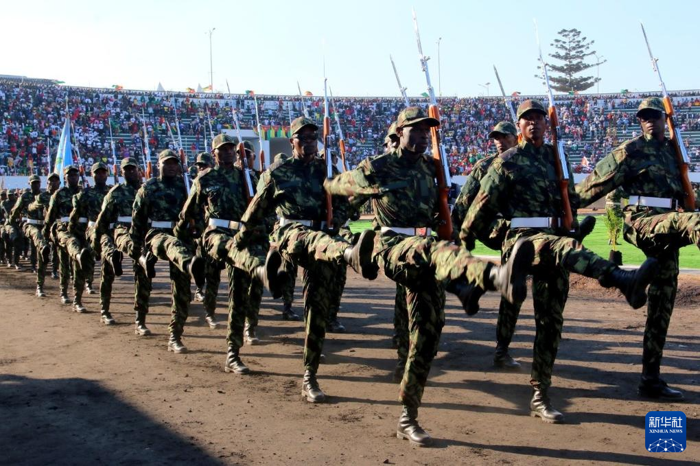 6月25日,在马普托省马托拉市举行的莫桑比克独立50周年庆典上,士兵们参加阅兵式。