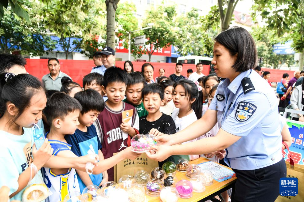 6月26日,在河南省济源市源园广场,民警通过仿真毒品模型讲解禁毒知识。