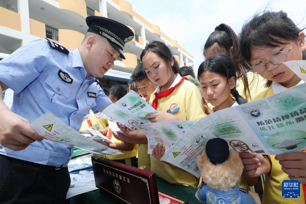 6月25日,在河南省焦作市博爱县新华小学,社区民警为学生讲解毒品危害。