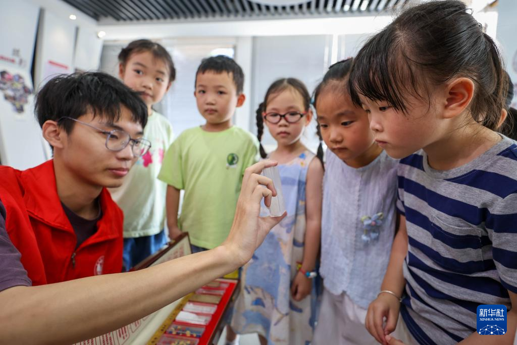 6月26日,在浙江省湖州市德清县雷甸镇中兴社区,志愿者通过毒品仿真模型介绍伪装的毒品。