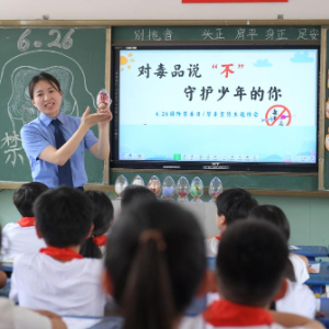 6月26日,江苏省泰州市公安局海陵分局九龙派出所民警在九龙实验学校为学生介绍禁毒知识。