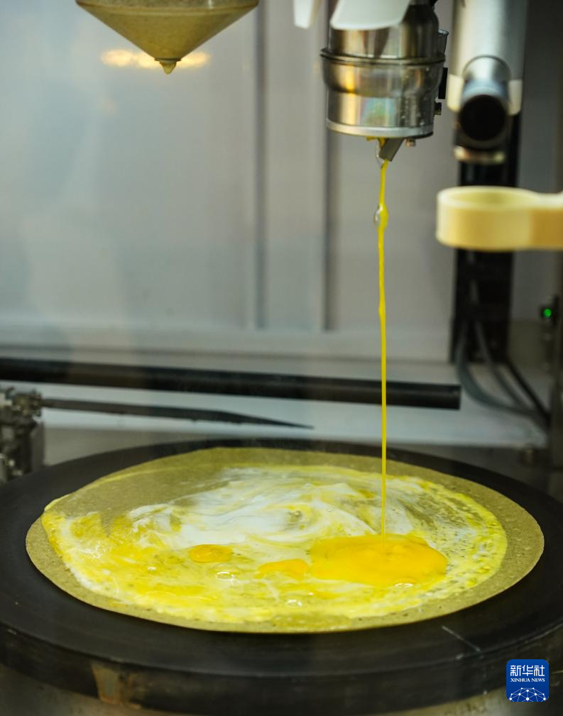 天津一家便利店内的煎饼馃子机器人在制作煎饼馃子(6月11日摄)。