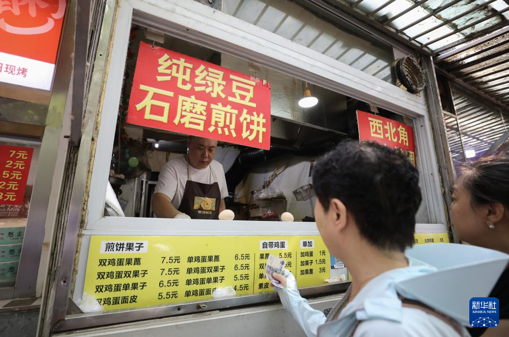 在天津市红桥区西北角特色街区,商家给顾客递煎饼馃子(6月10日摄)。