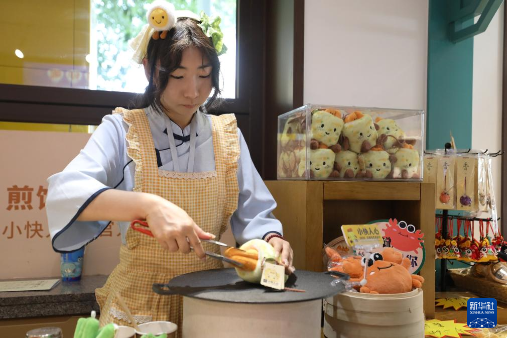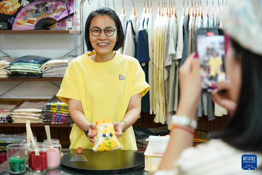 在天津市和平区的一家文创商店,工作人员模拟制作煎饼馃子的过程,为顾客准备煎饼馃子玩偶(6月11日摄)。