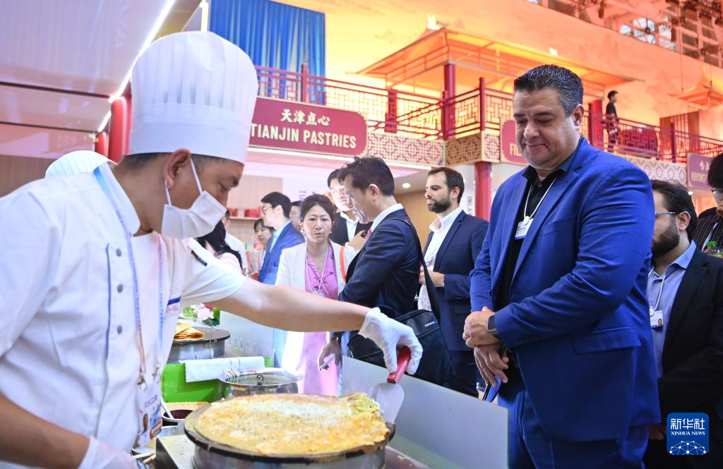 嘉宾在2025年夏季达沃斯论坛文化之夜上品尝煎饼馃子(6月25日摄)。