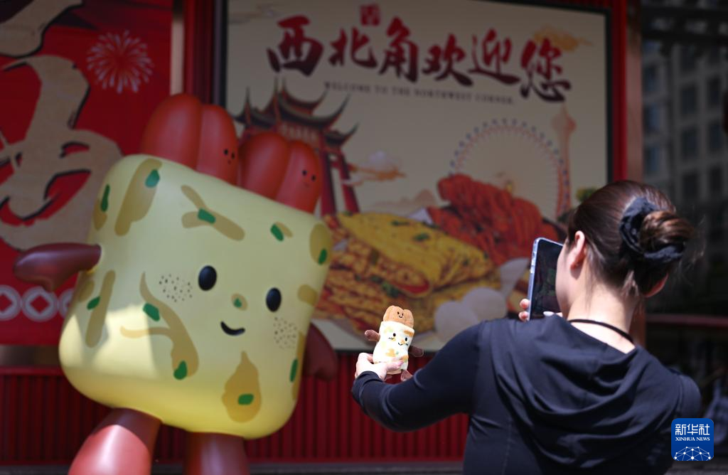 在天津市红桥区西北角特色街区,一名游客手持煎饼馃子玩偶拍照(6月10日摄)。