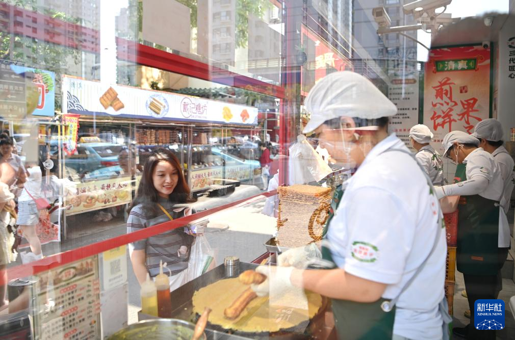 人们在天津市红桥区西北角特色街区吃煎饼馃子(6月10日摄)。