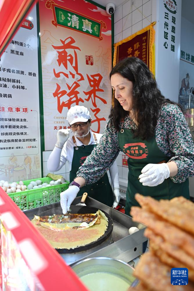 6月24日至26日,2025年夏季达沃斯论坛在天津举行,世界各地的嘉宾汇聚渤海之滨。煎饼馃子,这道天津经典小吃作为当地饮食文化的代表之一,成为达沃斯论坛文化展示中的一项。