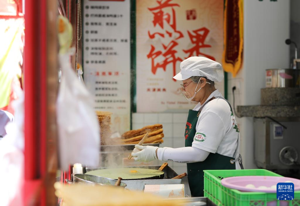 商家在天津市红桥区西北角特色街区制作煎饼馃子(6月10日摄)。
