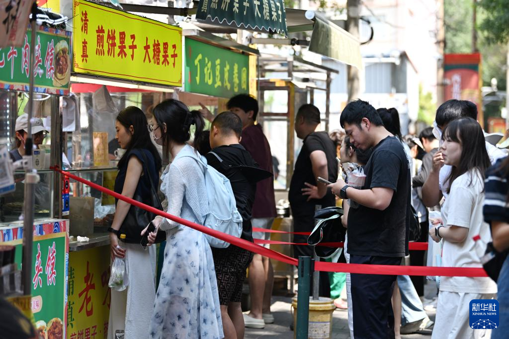 人们在天津市红桥区西北角特色街区排队购买煎饼馃子(6月10日摄)。