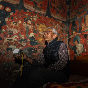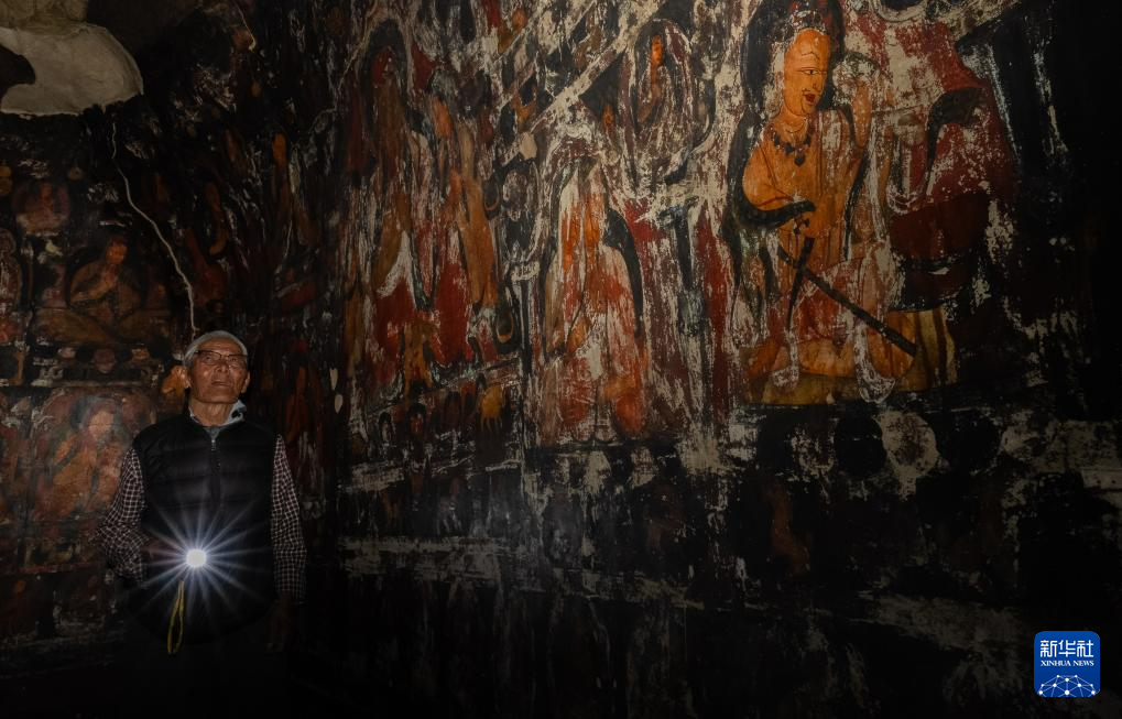 早上十点,仁增旺扎会从家出发,顺着400多级陡峭的台阶,几步一歇地爬上石窟。抵达后,他会先把石窟打扫干净,然后爬上爬下,重点检查几处有壁画的石窟内是否有渗水、坍塌等风险。有游客来参观时,他会给游客讲解石窟及壁画的悠久历史,也会提醒他们要注意保护壁画;送走游客,他总会细心关好每一扇石窟的门。忙碌间隙,他习惯坐在石窟前,喝点自带的酥油茶,嚼几口糌粑——这便是仁增旺扎二十余年如一日的守窟日常。