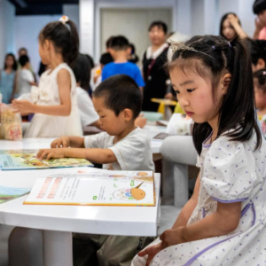 6月28日,在长沙图书馆湘江新区周家湾分馆,志愿者为小朋友进行书籍导读。