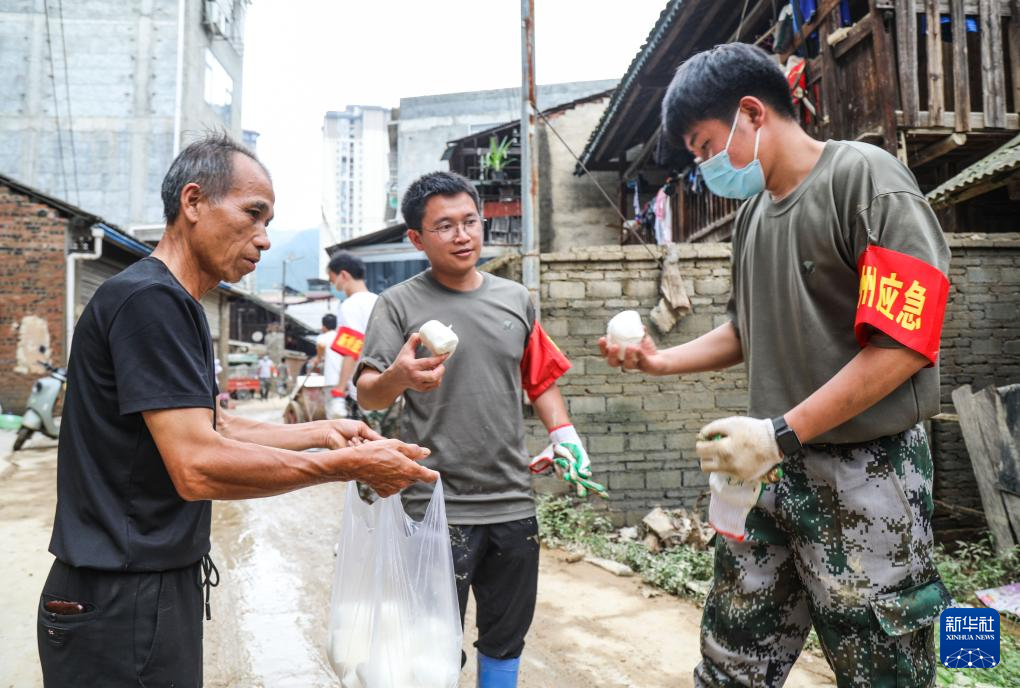 6月27日,在贵州省榕江县城,村民(左)将蒸好的馒头送到救援人员手中。