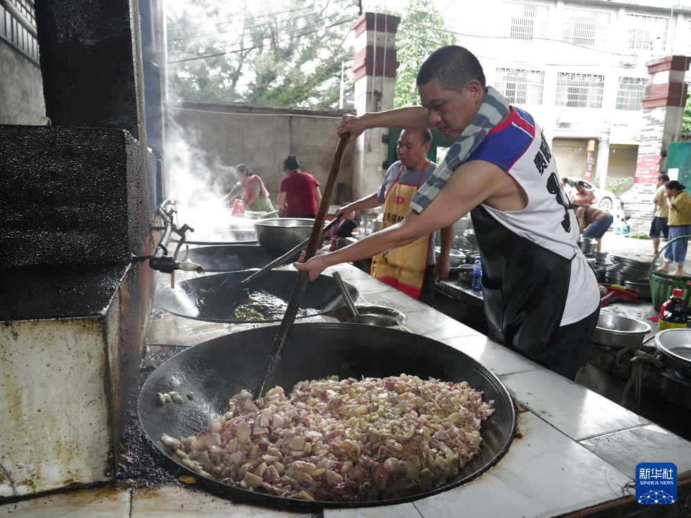 6月26日,村民在贵州省榕江县忠诚镇一处后勤伙食保障点炒菜。
