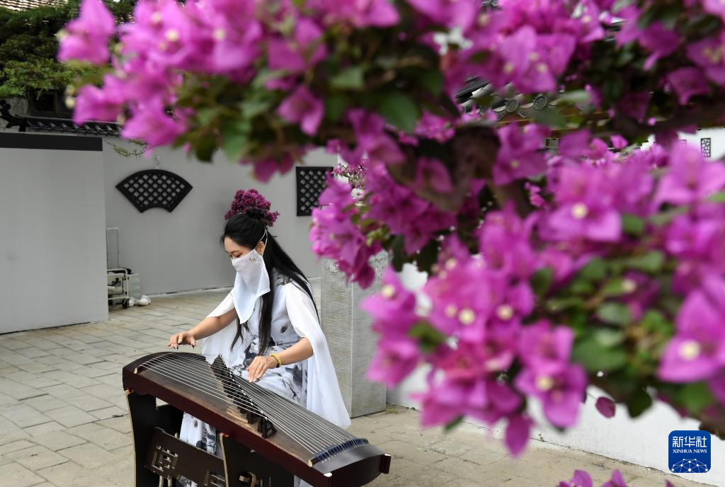 6月28日,表演者在圆明园“荷韵梅芳 御苑双姝”双花展现场演奏、舞蹈。