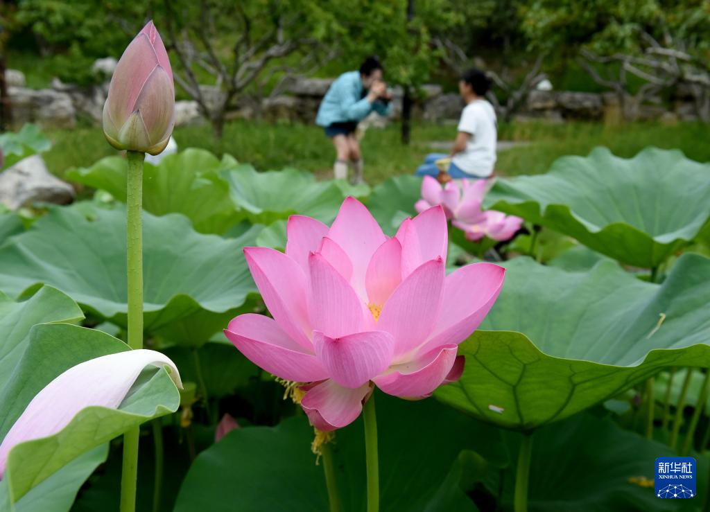 6月28日,游客在在圆明园“荷韵梅芳 御苑双姝”双花展上拍摄。