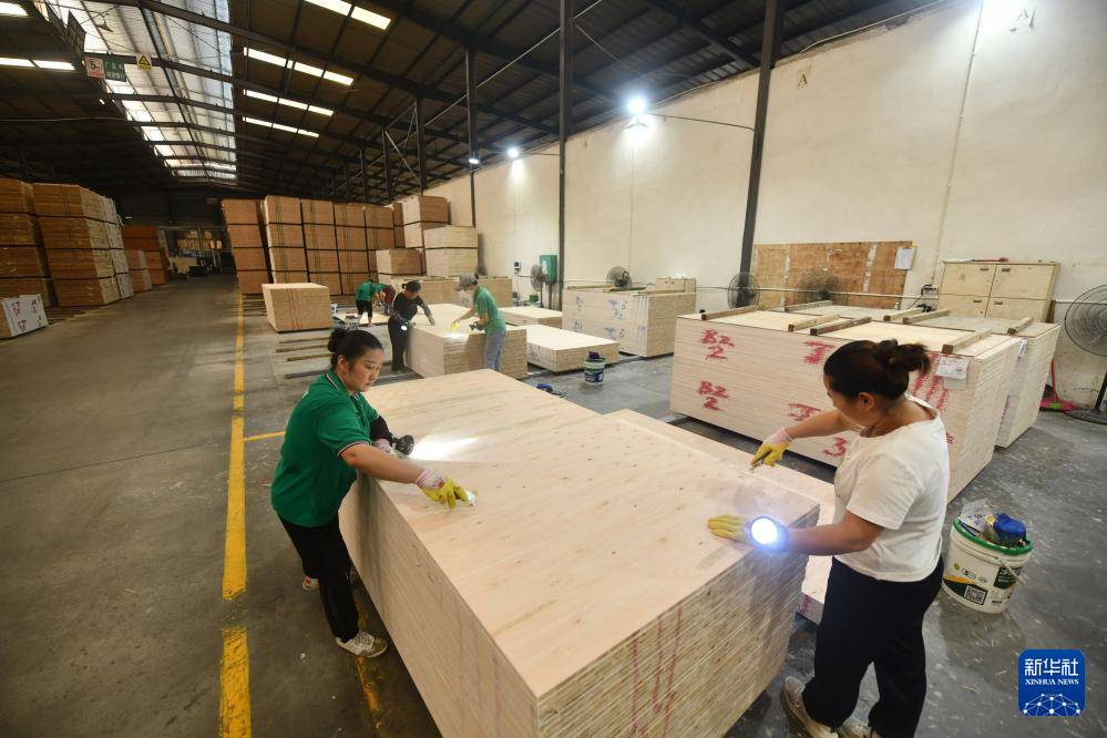 6月29日,工人在融安县一家香杉生态板生产企业的生产线上作业。
