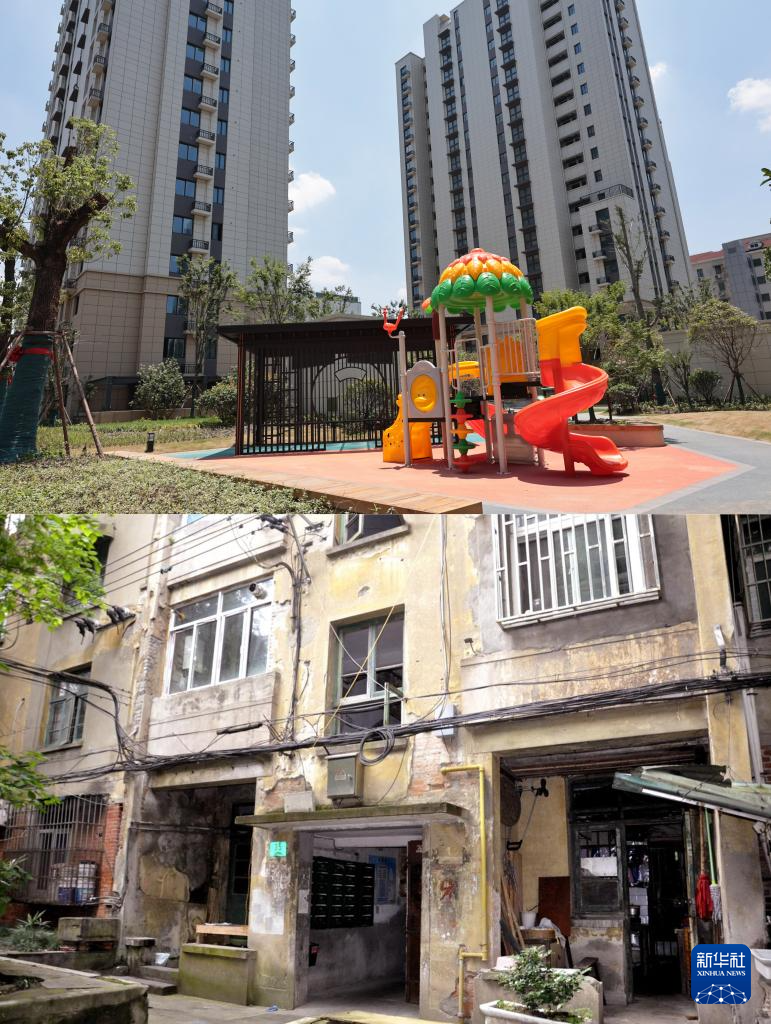 拼版照片:上图为完成改造的彭一小区外景(6月27日摄,新华社记者方喆摄);下图为改造前的彭一小区外景(资料照片,静安区新闻办供图)。