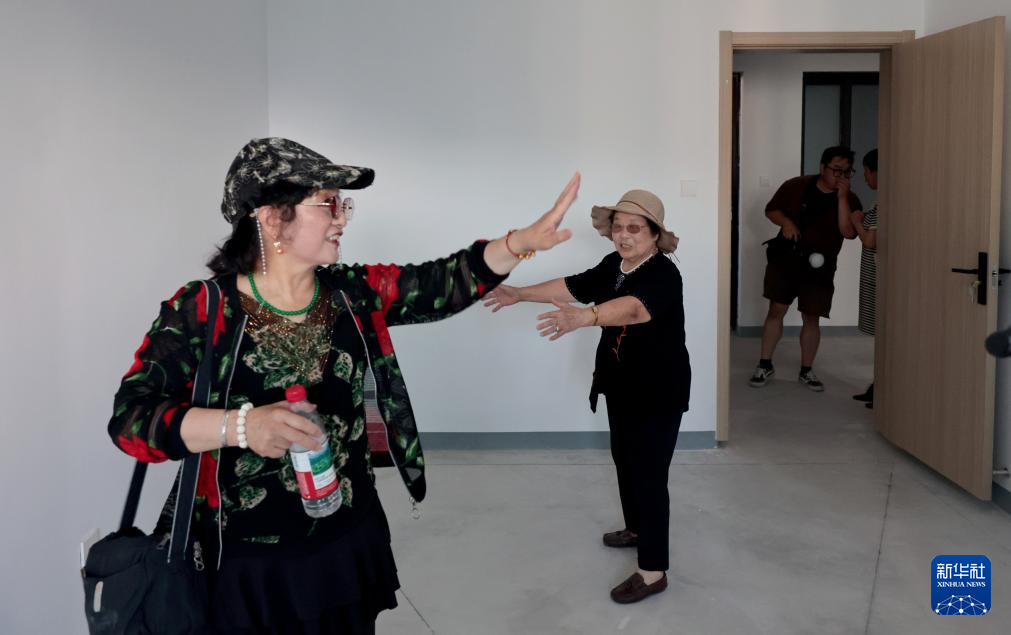 6月29日,两名居民在样板房内商讨房间内的家具布置。