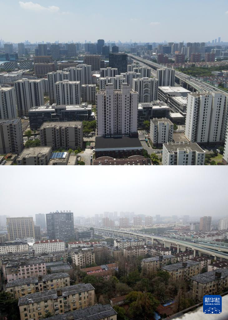 拼版照片:上图为无人机拍摄的完成改造的彭一小区(6月27日摄,新华社记者方喆摄);下图为彭一小区改造前俯瞰图(资料照片,静安区新闻办供图)。
