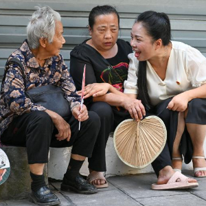 6月27日,重庆市永川区双石镇双石社区工作人员姜春艳在街上与居民交流。