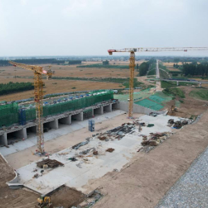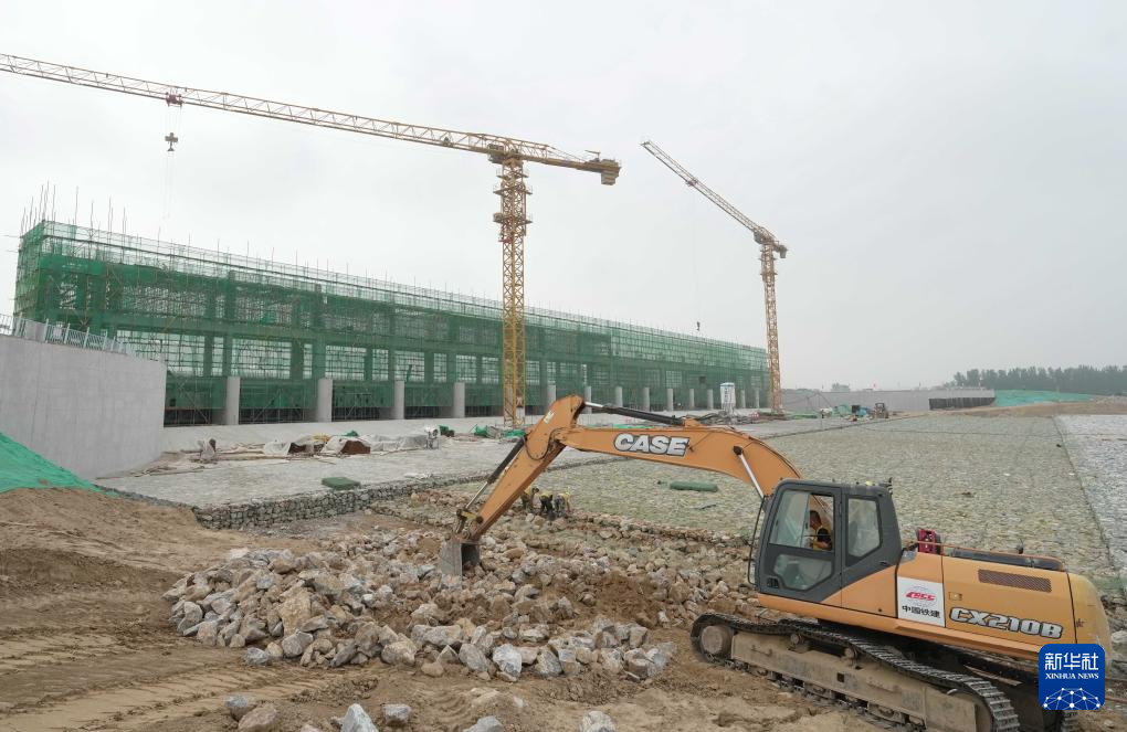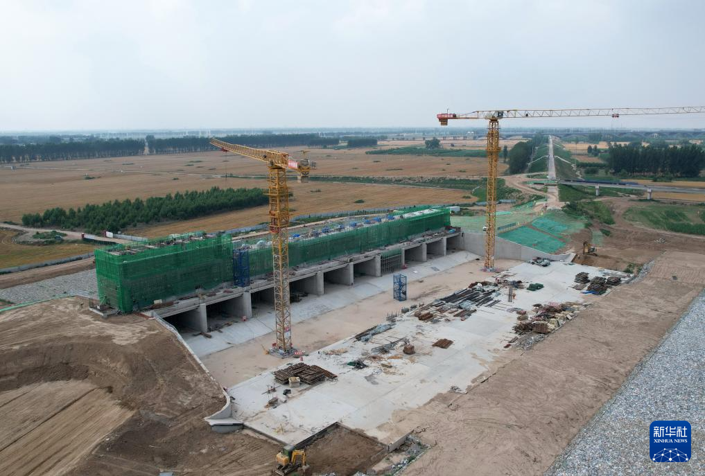 6月29日拍摄的兰沟洼蓄滞洪区(高碑店段)东马营退洪闸建设工地(无人机照片)。