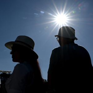 6月30日,在英国伦敦温布尔登网球公开赛赛场,一名女子用手遮挡阳光。