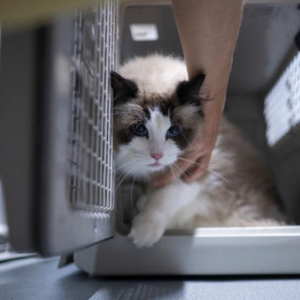 7月1日,一只宠物猫在专用宠物运输箱内。