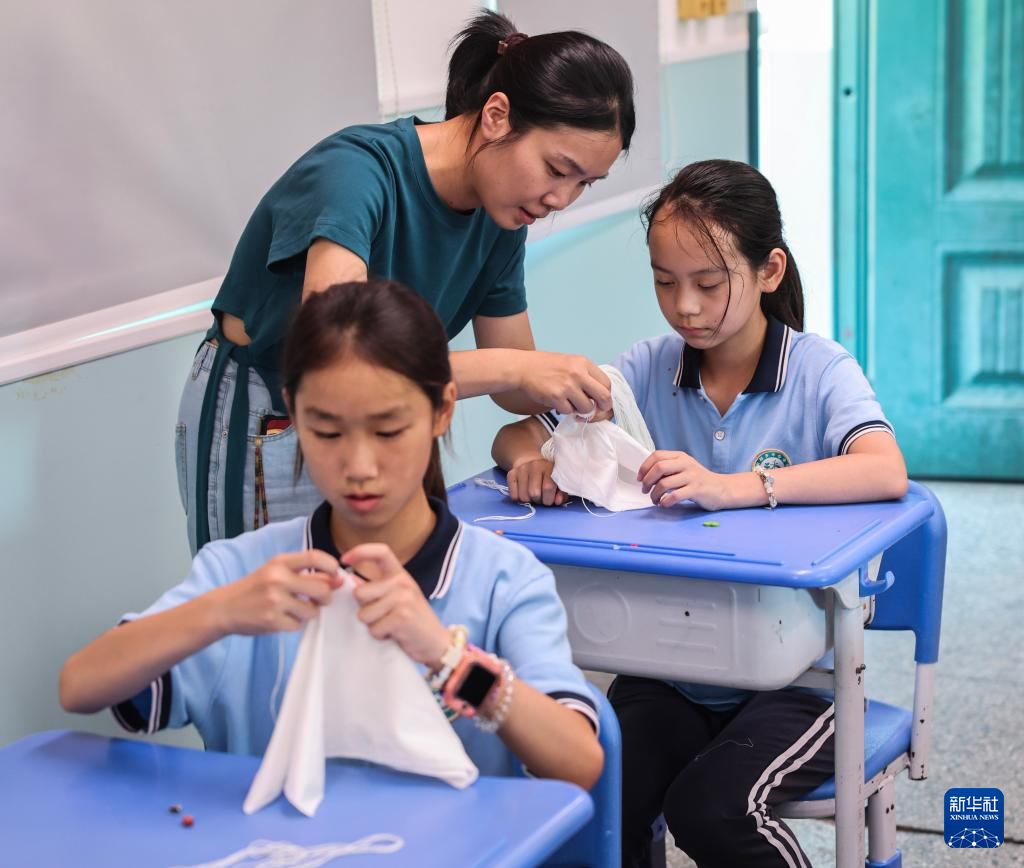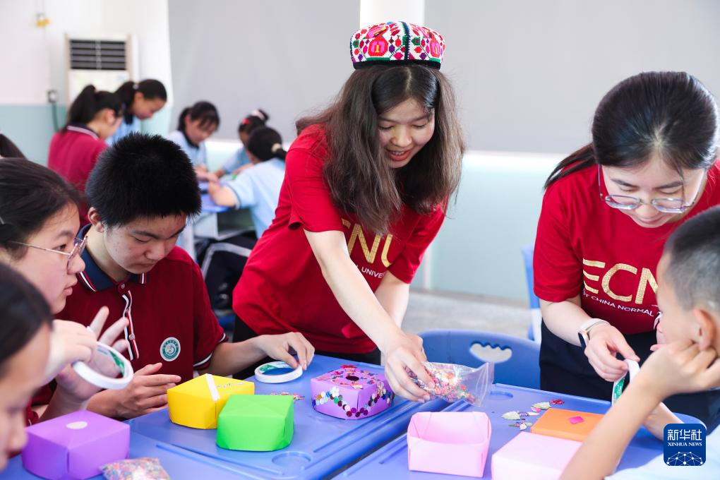7月1日,华东师范大学的大学生志愿者阿依谢(右二)教孩子们制作花帽。