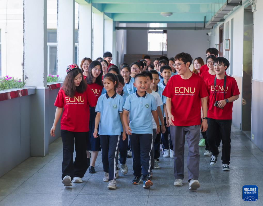7月1日,华东师范大学的大学生志愿者带着东和乡中心学校的孩子去上课。