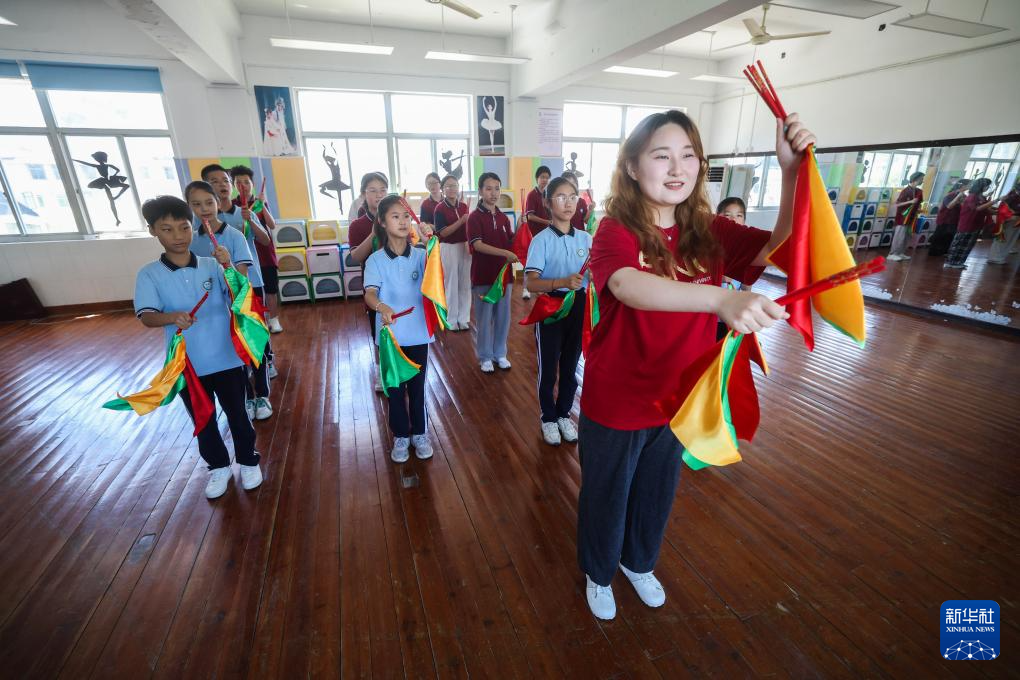 7月1日,华东师范大学的蒙古族大学生志愿者王馨瑜给孩子们示范筷子舞。