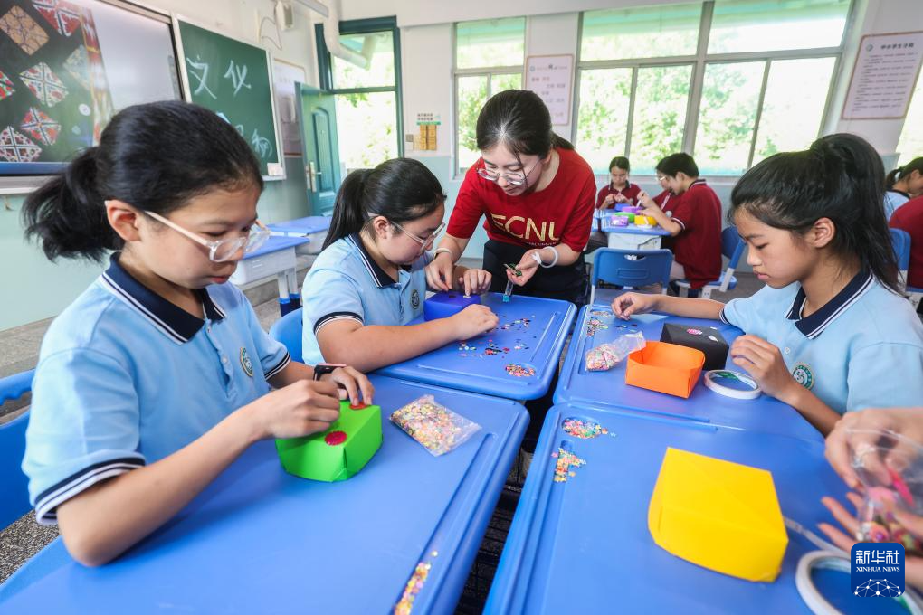 7月1日,华东师范大学的大学生志愿者教孩子们制作花帽。