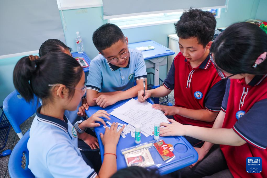 7月1日,东和乡中心学校的孩子们在进行拼贴诗的游戏。
