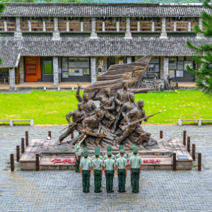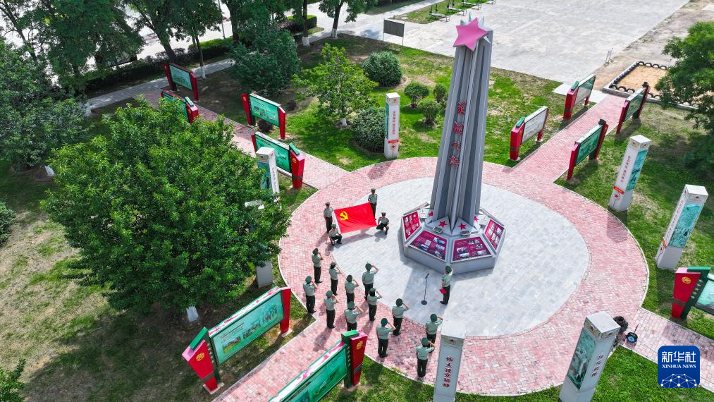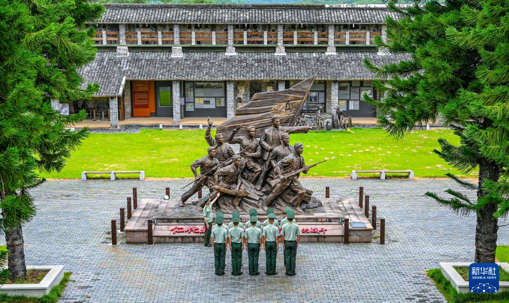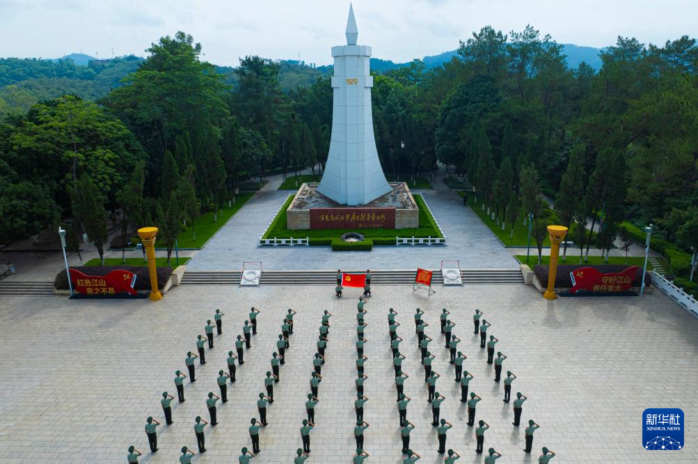 陆军第76集团军某旅开展主题党日活动,官兵们在中国工农红军西路军纪念馆重温入党誓词(无人机照片,6月30日摄)。