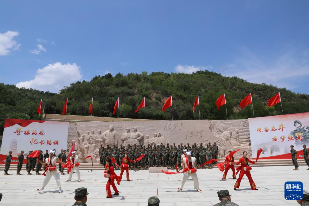 武警陕西总队新兵团官兵在延安与地方群众开展“红歌联唱”文化活动(6月29日摄)。