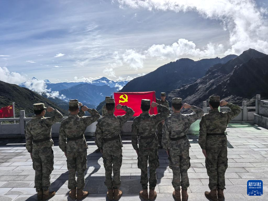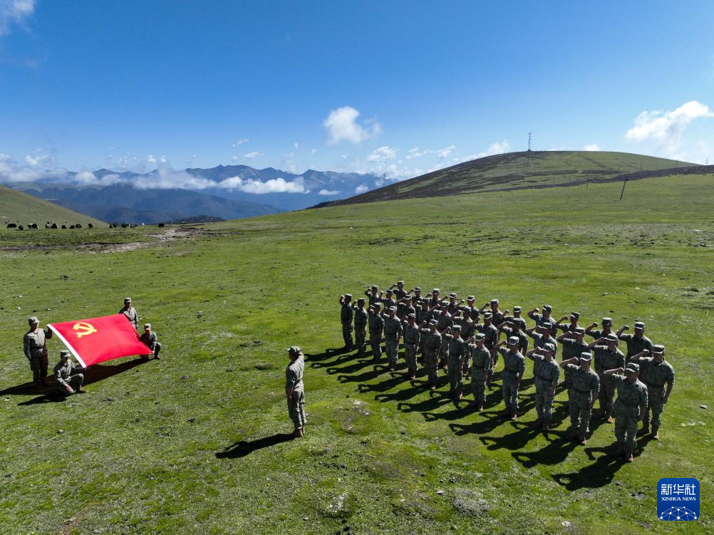 西藏军区某边防团乃堆拉哨所官兵举行重温入党誓词活动(6月30日摄)。