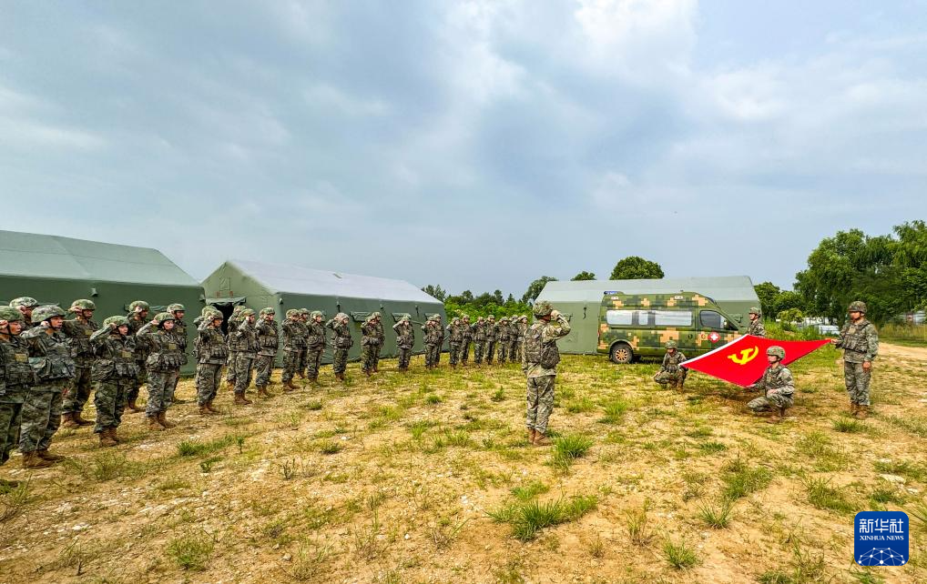联勤保障部队第902医院医疗队野外驻训期间组织党员重温入党誓词(6月29日摄)。