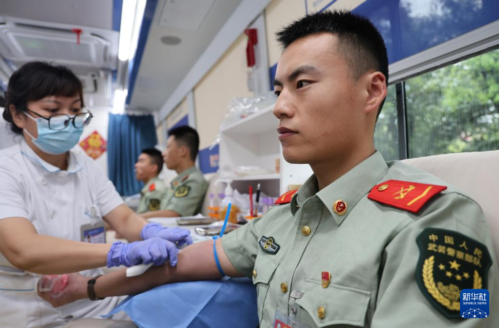 武警湖南总队医院组织官兵开展“迎七一”公益献血活动(6月29日摄)。