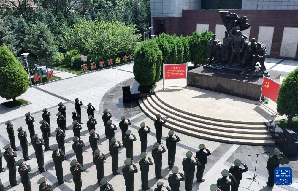 武警第一机动总队某支队组织党员在军史长廊重温入党誓词(无人机照片,7月1日摄)。