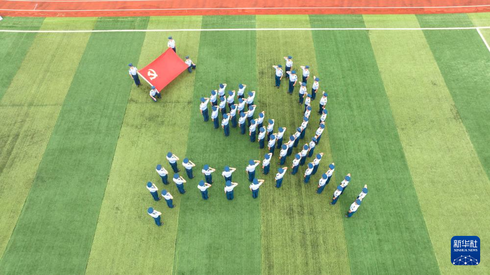 南部战区空军航空兵某旅开展“风雨一百零四载,奋进强军新征程”重温入党誓词仪式,组织新老党员集体过“政治生日”(无人机照片,6月29日摄)。
